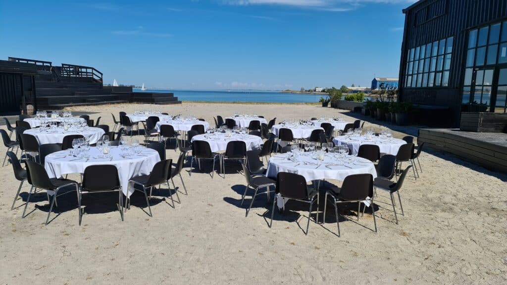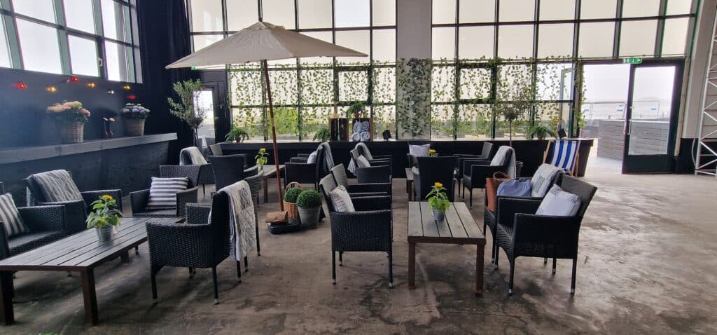På Balkonen er der udsigt over den store sal og det store vinduesparti, med udkig til lystbådehavnen.